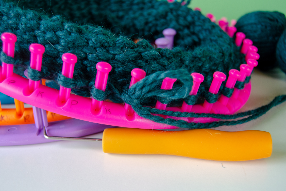 For knitting and yarn crafts. Loom includes metal hook and plastic needle.