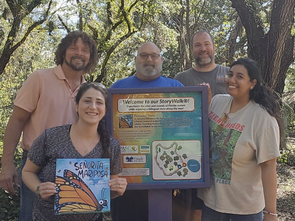 Our Withlacoochee StoryWalk®, located in Dade City, is a 0.30-mile trail with 18 posts. Station posts feature pages from the story Señorita Mariposa by Ben Gundersheimer, along with interactive prompts, fun facts, and local wildlife photos.